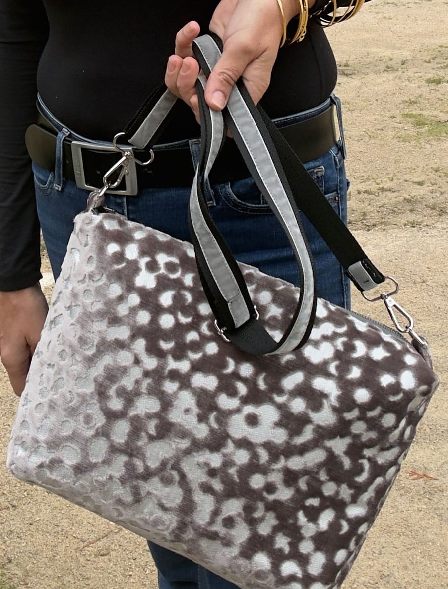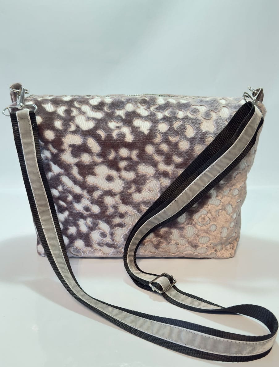 Precioso bolso bandolera. En una tela combinando textiles con su estampado en terciopelo gris ratón de primera calidad, le dan a este bolso un toque exclusivo. Su correa combinada en negro con cinta de terciopelo gris, a juego con la pieza, provoca un contraste luminoso, diferente y único. Forrado con una tela combinada de seda italiana de primerísima calidad , con doble bolsillo.