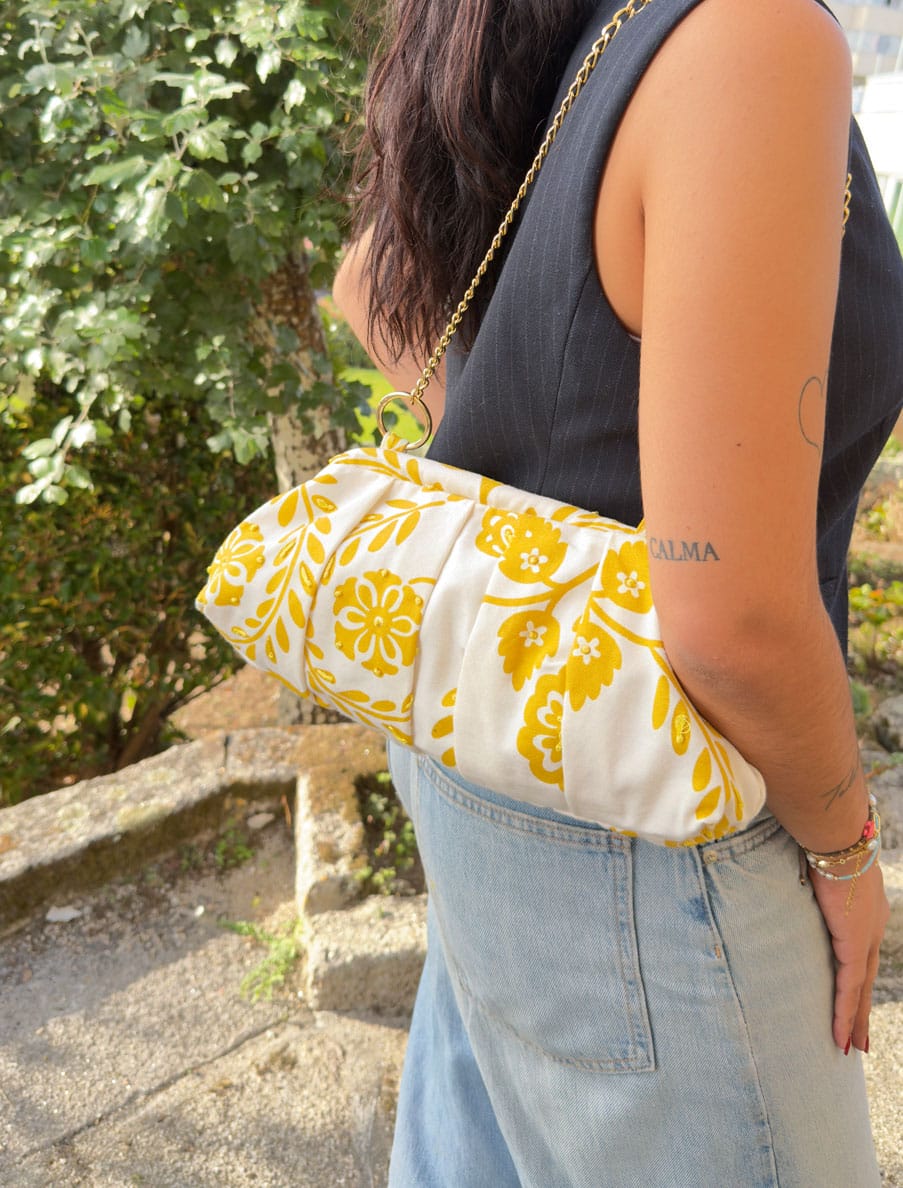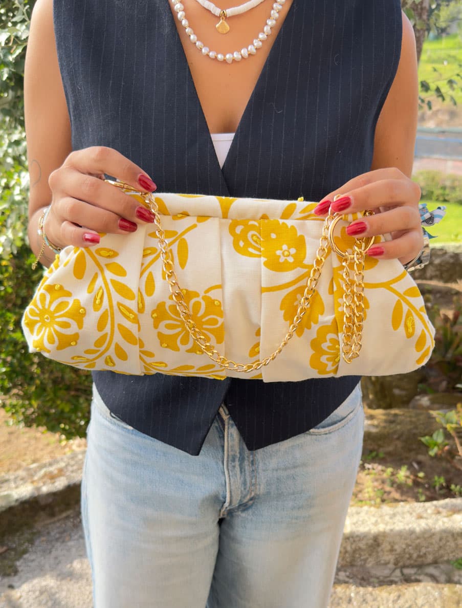 Bolso con boquilla tubular en tela de lino y algodón con pequeños bodoques en hilo amarillo que le dan un toque especial.  Confeccionado con pliegues.