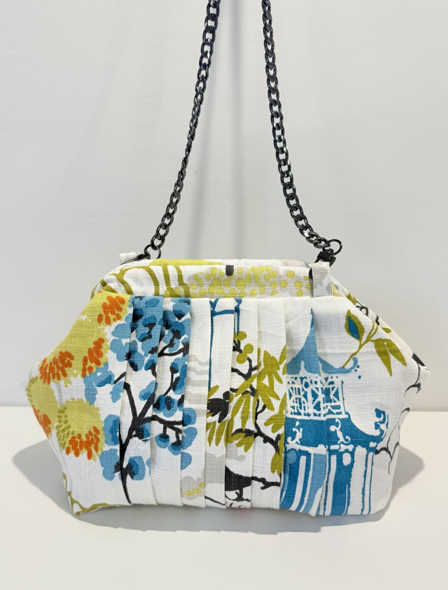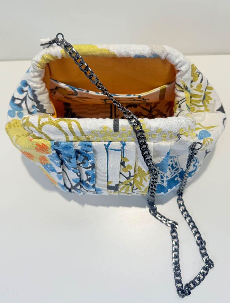 Bolso con boquilla tubular en tela de lino y algodón con pequeños bodoques en hilo amarillo que le dan un toque especial. Confeccionado con pliegues.
