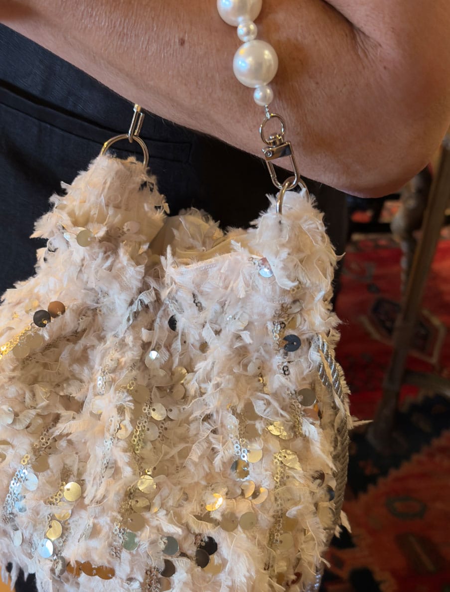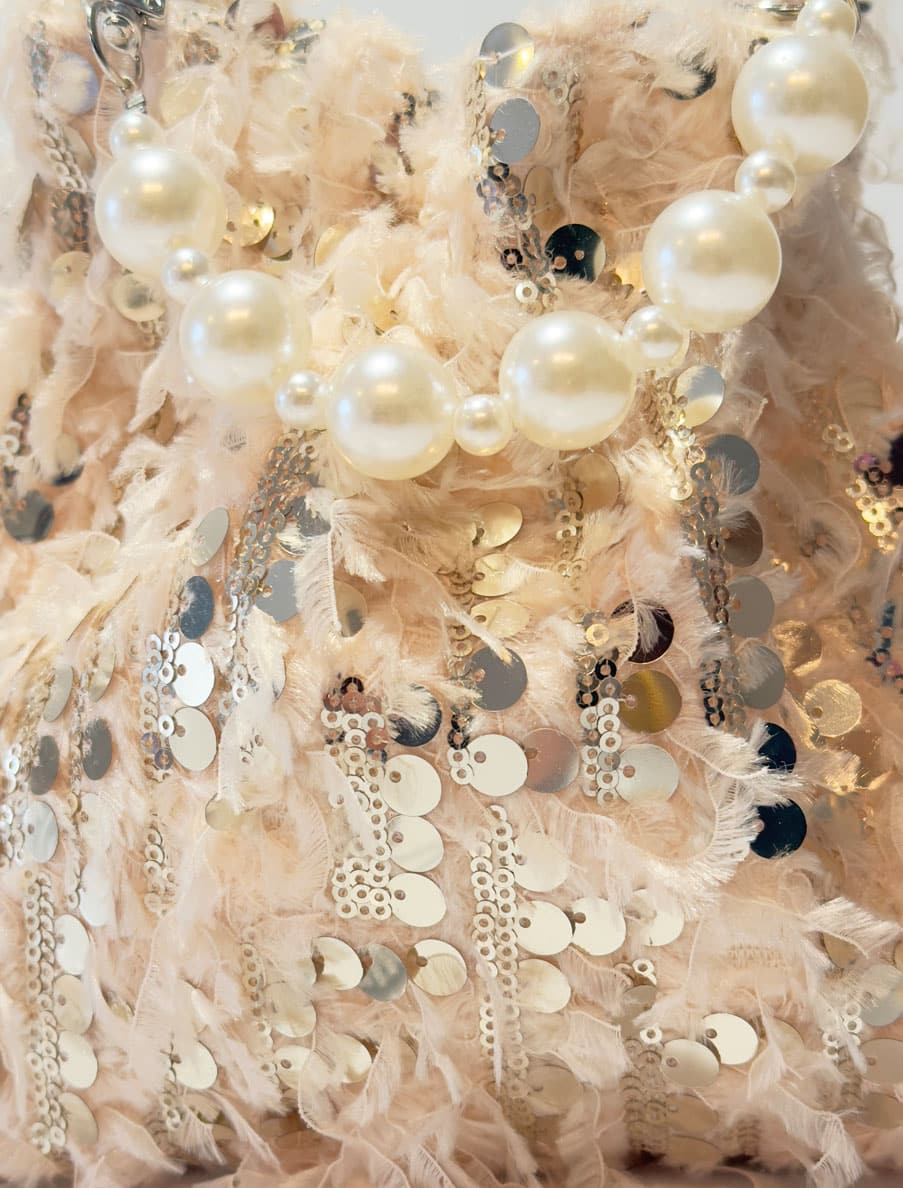 Esta pequeña bombonera, con el tamaño perfecto para llevar los “imprescindibles” a cualquier evento. Original y elegante, gracias a su tela de “plumilla” en un rosado palo, combinado con sutiles lentejuelas plateadas y un asa ideal en perlas. Elegancia y distinción en un “complemento directo” único e irrepetible.