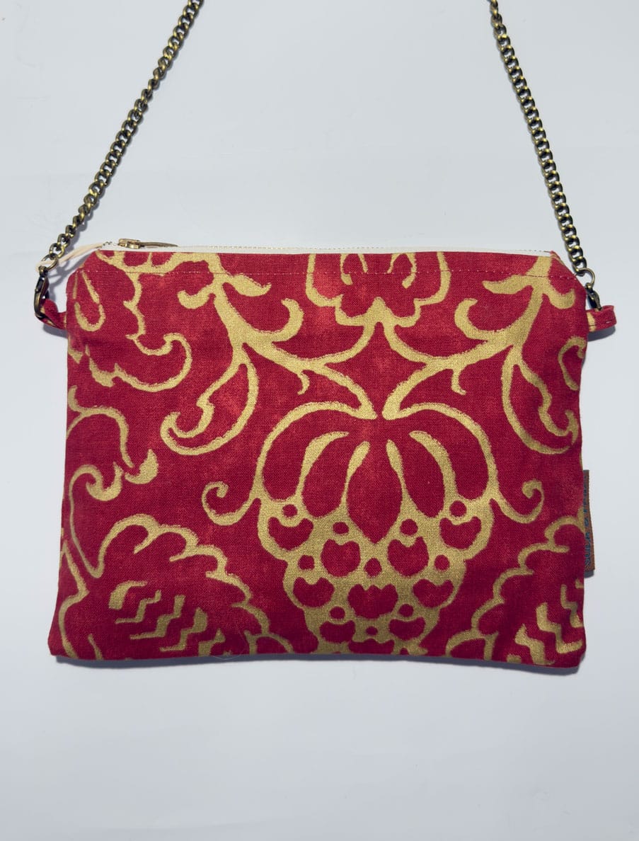 Cartera de mano de cruzar. Tela encerada, combinando rojo/granate y ocre, a juego con su cadena. Cuenta con bolsillo en su interior.