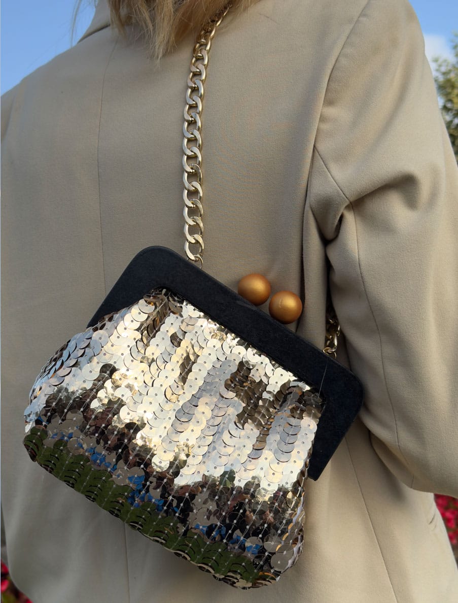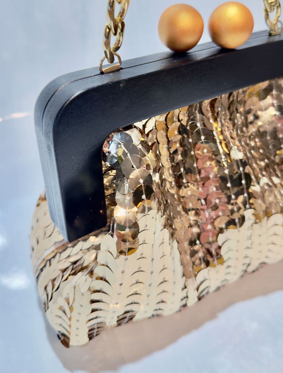 Qué bonito es el dorado! Cómo lucen las lentejuelas! Este bolso, de boquilla de madera, luce con un look casual y con un look formal. Este bolso de “Sula&Frida” luce… SOLO!