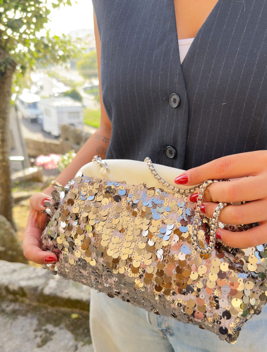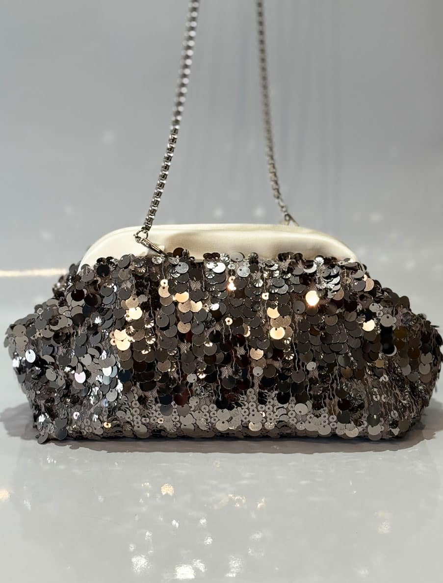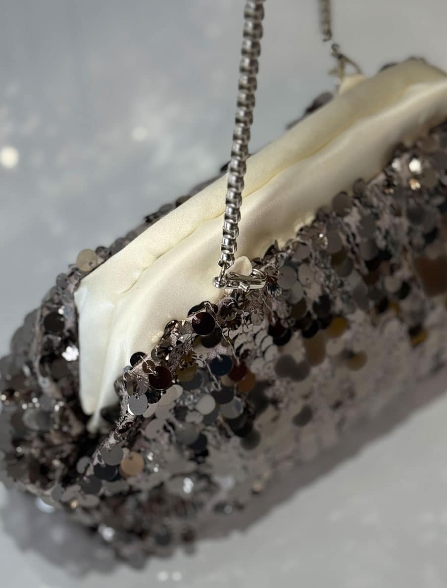 Bolso de boquilla tubular. Lentejuelas de brillo gris, combinado con negro. Boquilla forrada en “satén novia”, a juego con el interior del mismo. Se puede lucir colgado, cruzado o como bolso de mano.