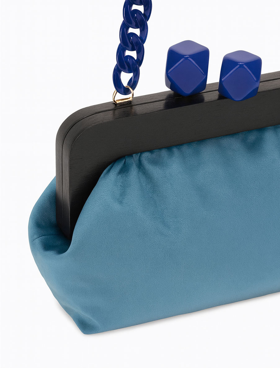 Elegante bolso con boquilla de madera en terciopelo de primera calidad azul plomo. Combinable con cualquier look, casual o formal. Estos bolsos tienen mucha más capacidad de la que aparentan. Pequeño bolso con gran estilo.