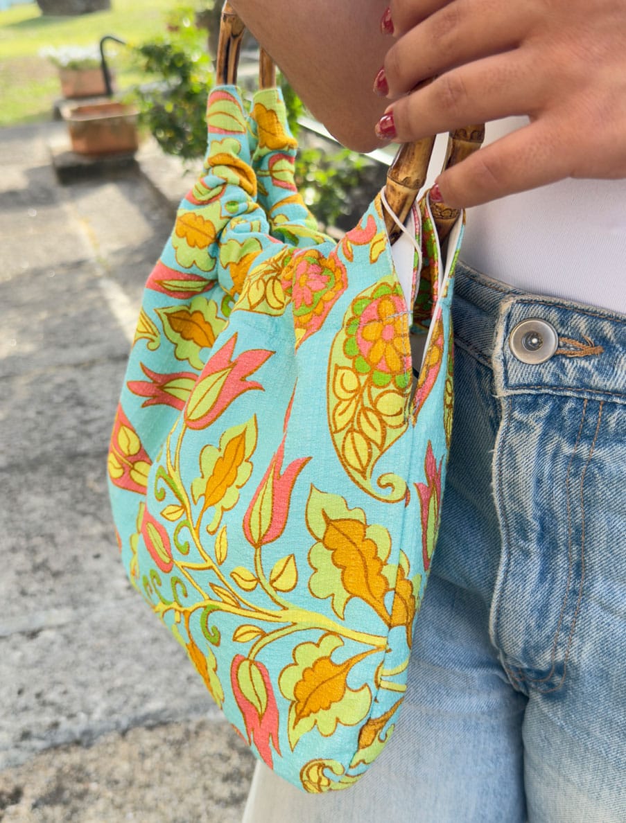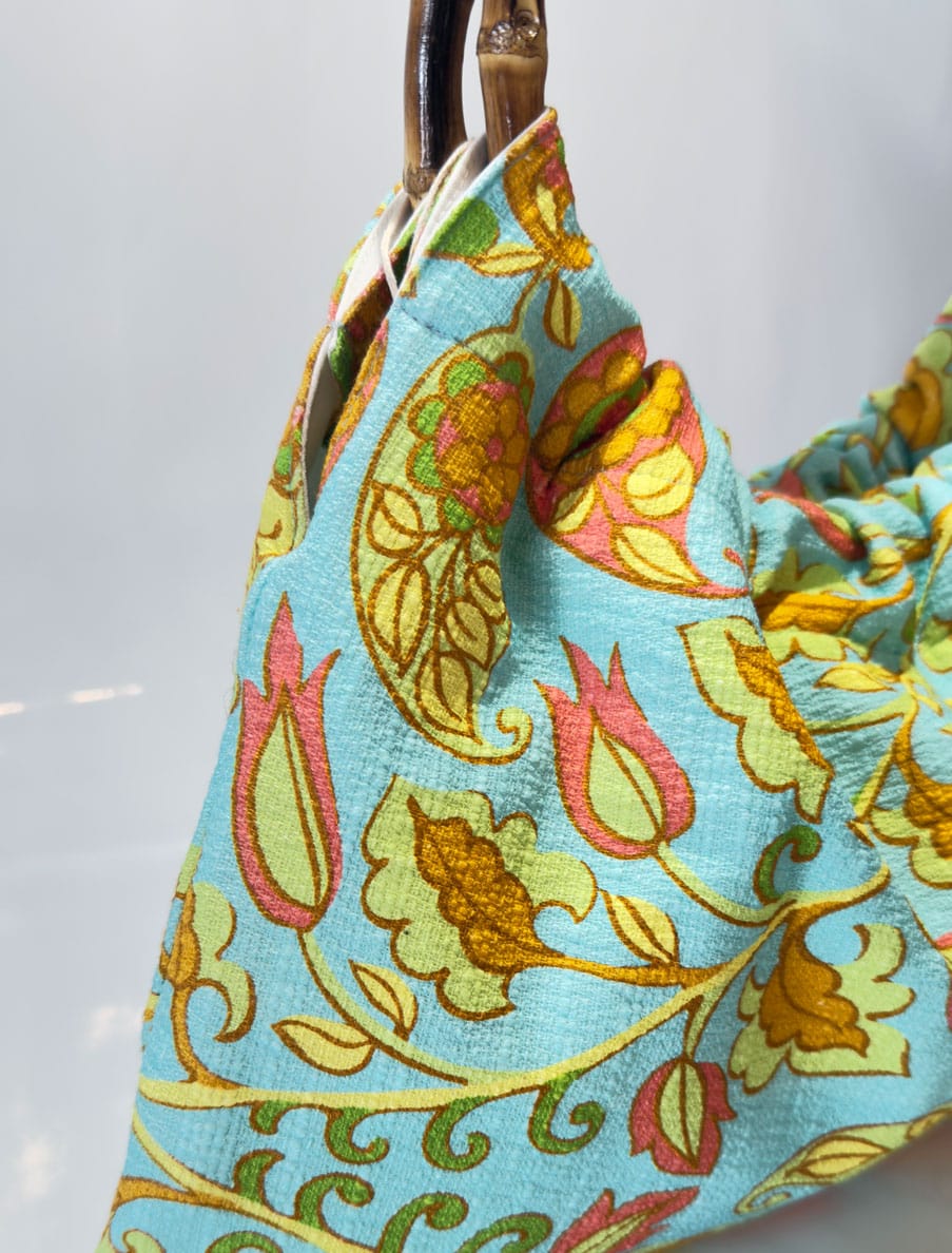 Espectacular tela de tapicería, inspirada en los años 70. Colorida y alegre. Este precioso bolso con boquilla de bambú, aportará a tu look un toque muy diferente, con estilo y espectacular.