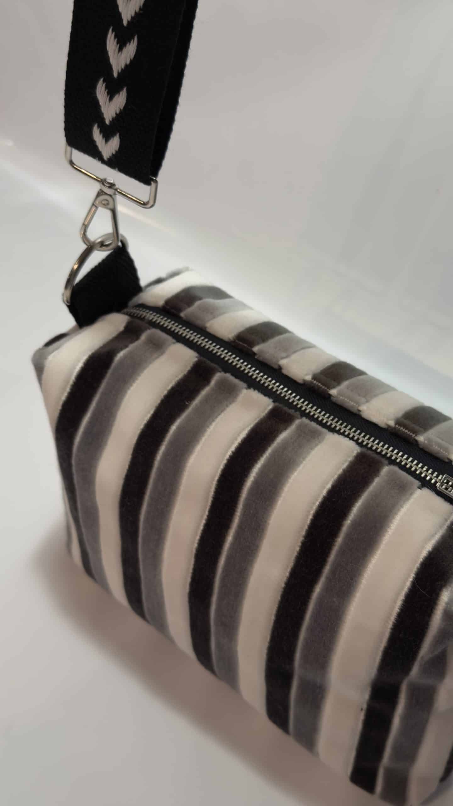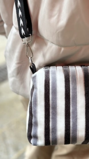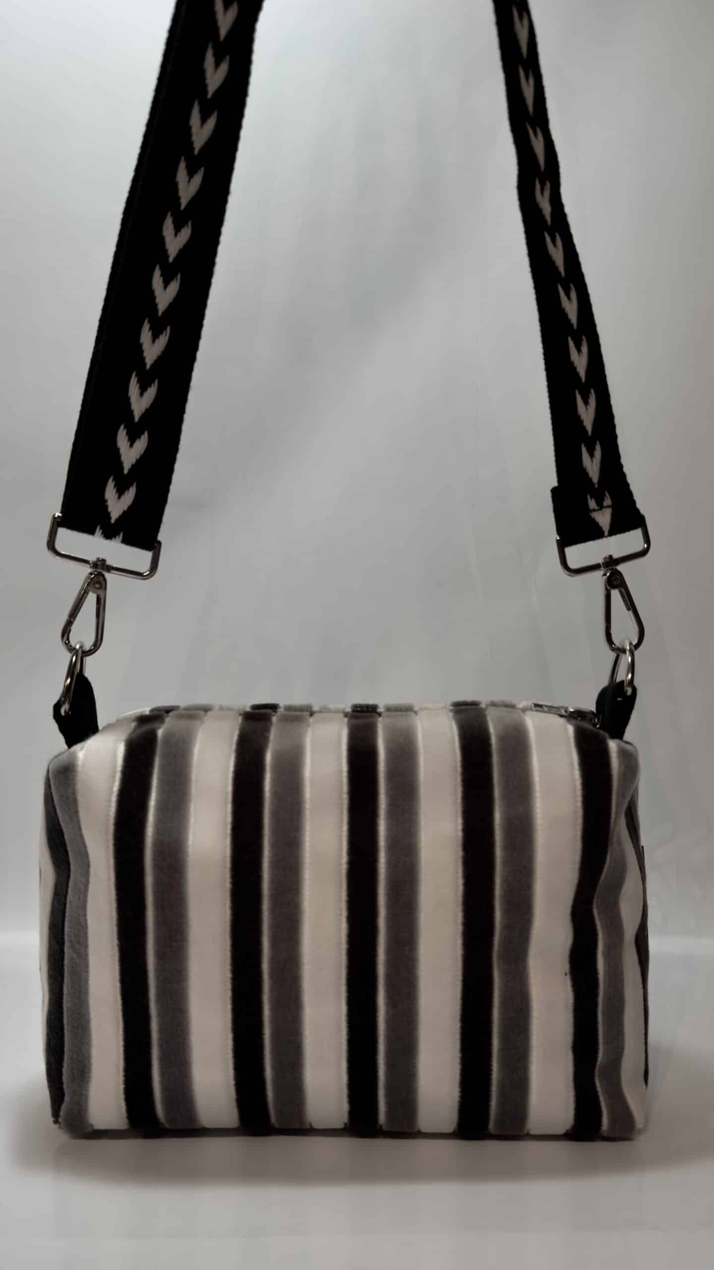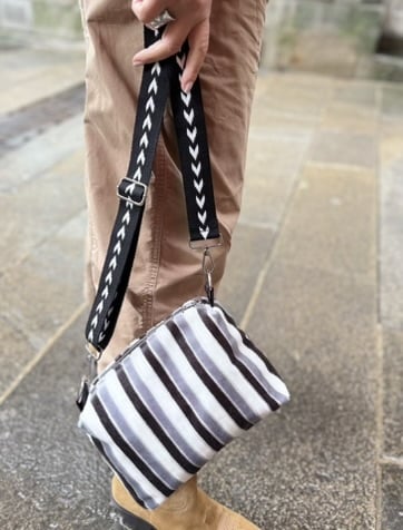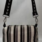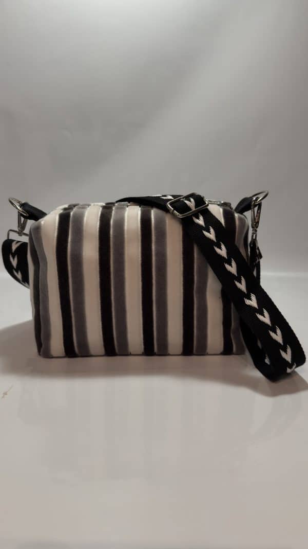 Precioso bolso bandolera, en tela Inglesa de tapicería a rayas, combinando tonos fríos. Cuenta con bolsillo interior y correa regulable en tonos a juego.