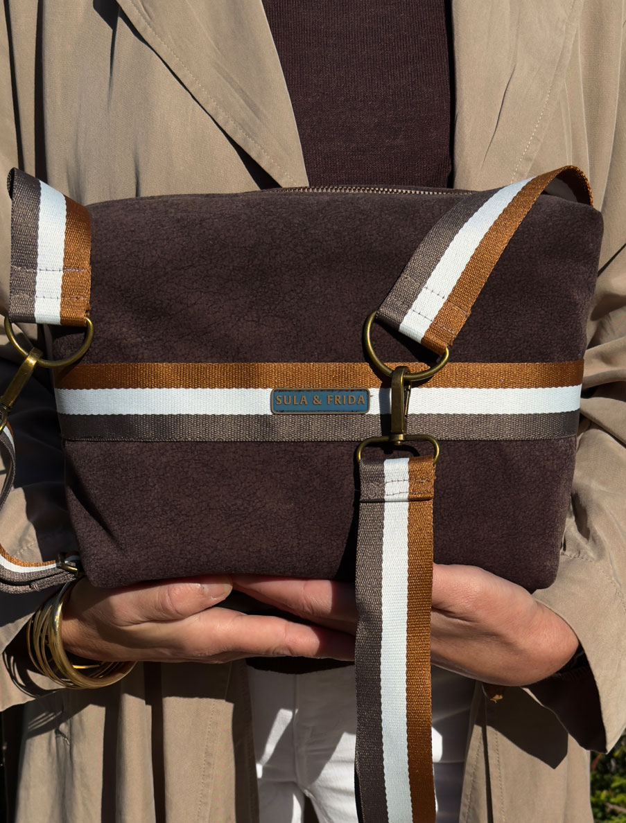 Bolso bandolera te tela de tapicería marrón chocolate, tan en tendencia, con un tacto super suave. Combinado con cinta de 3 colores, proporcionándole luz, originalidad y clase. Bolso cómodo y funcional con gran capacidad y bolsillo independiente en su interior para llevar nuestros imprescindibles.