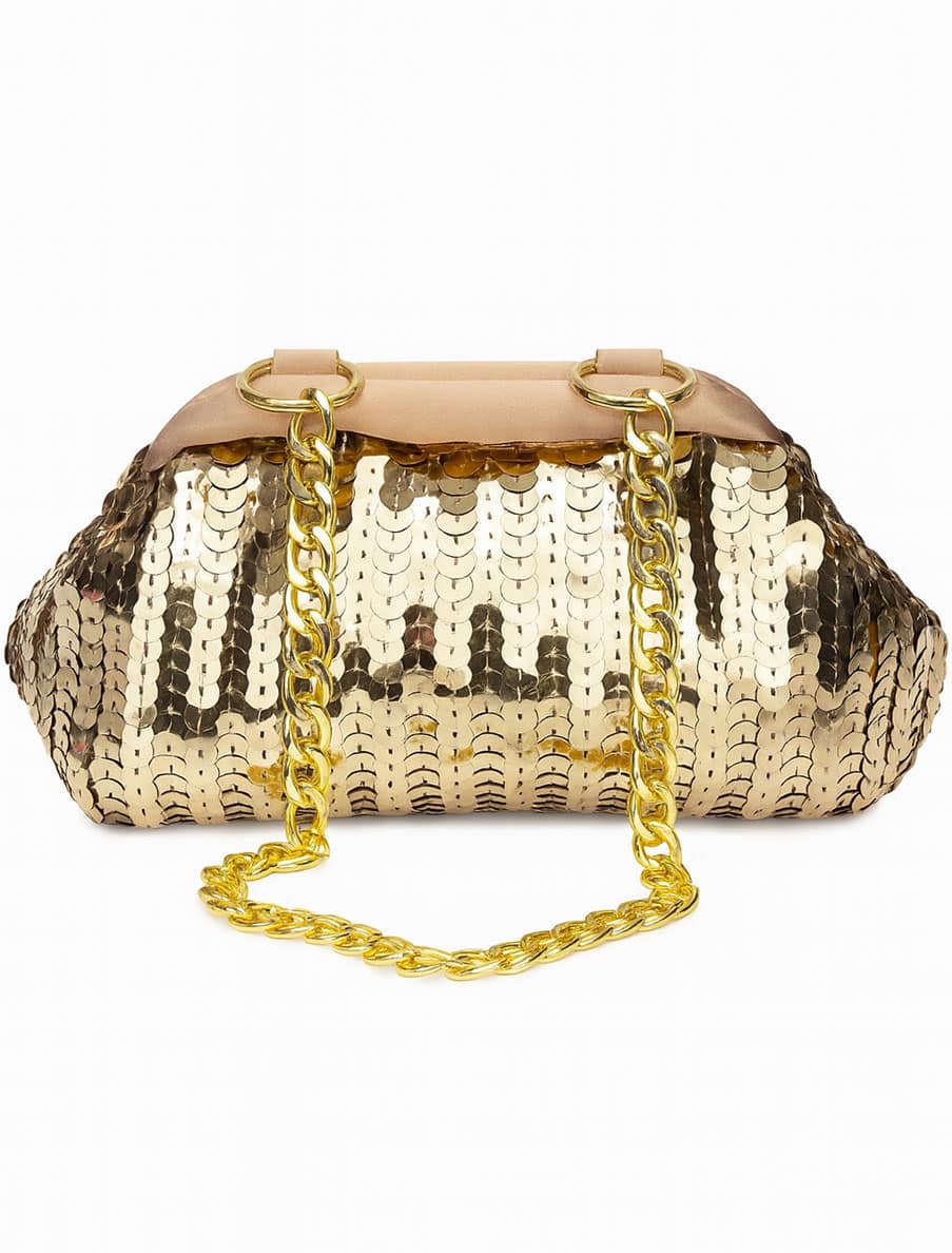 Bolso con boquilla tubular, combinando lentejuelas doradas con satén en tono ocre, a juego con el forro del mismo. Su cadena dorada sujeta con arandelas del mismo material, le aportan una luz que deslumbra. Este bolso no pasa desapercibido por su originalidad y elegancia.