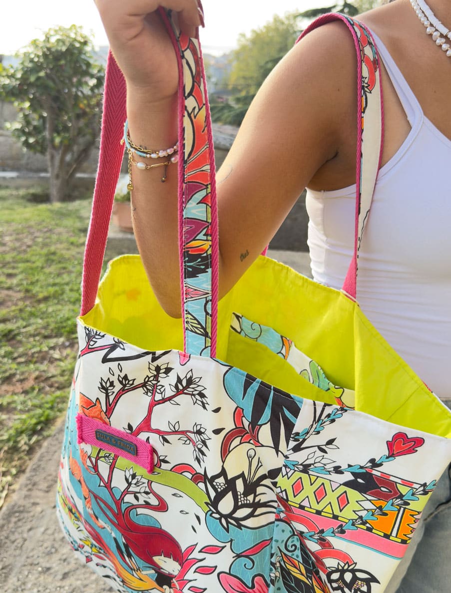 Preciosa Tote de playa, con unos colores y estampado espectaculares. Forrado en verde flúor con bolsillo interior en la misma tela, tan original!. Sus asas combinadas le aportan esa luz y originalidad especial.