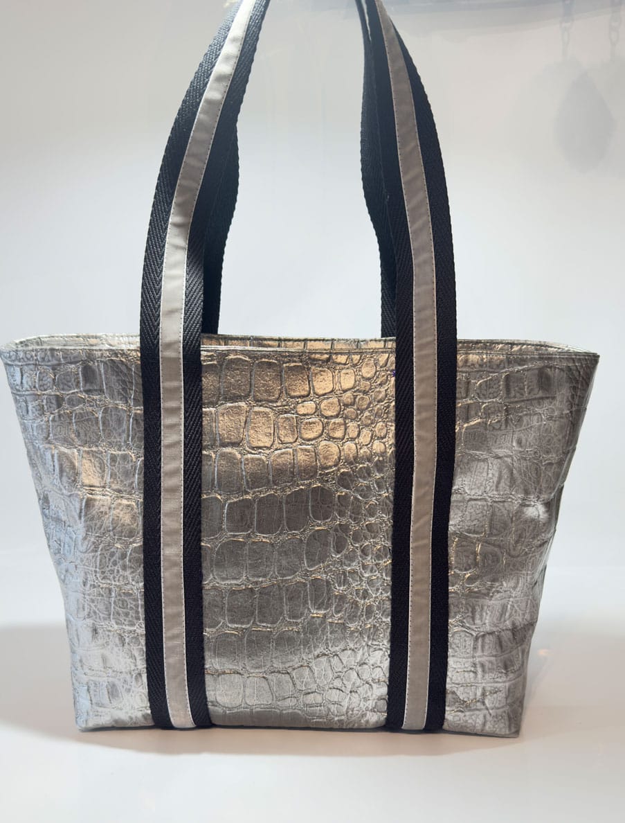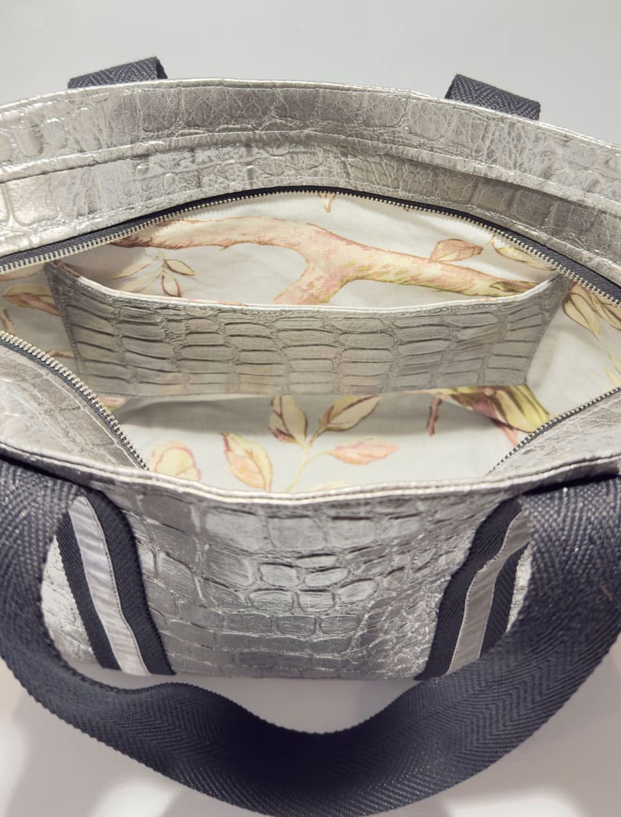 Tela imitación cocodrilo en plata de gran calidad. Forrado en lino azúl claro con un estampado combinado.