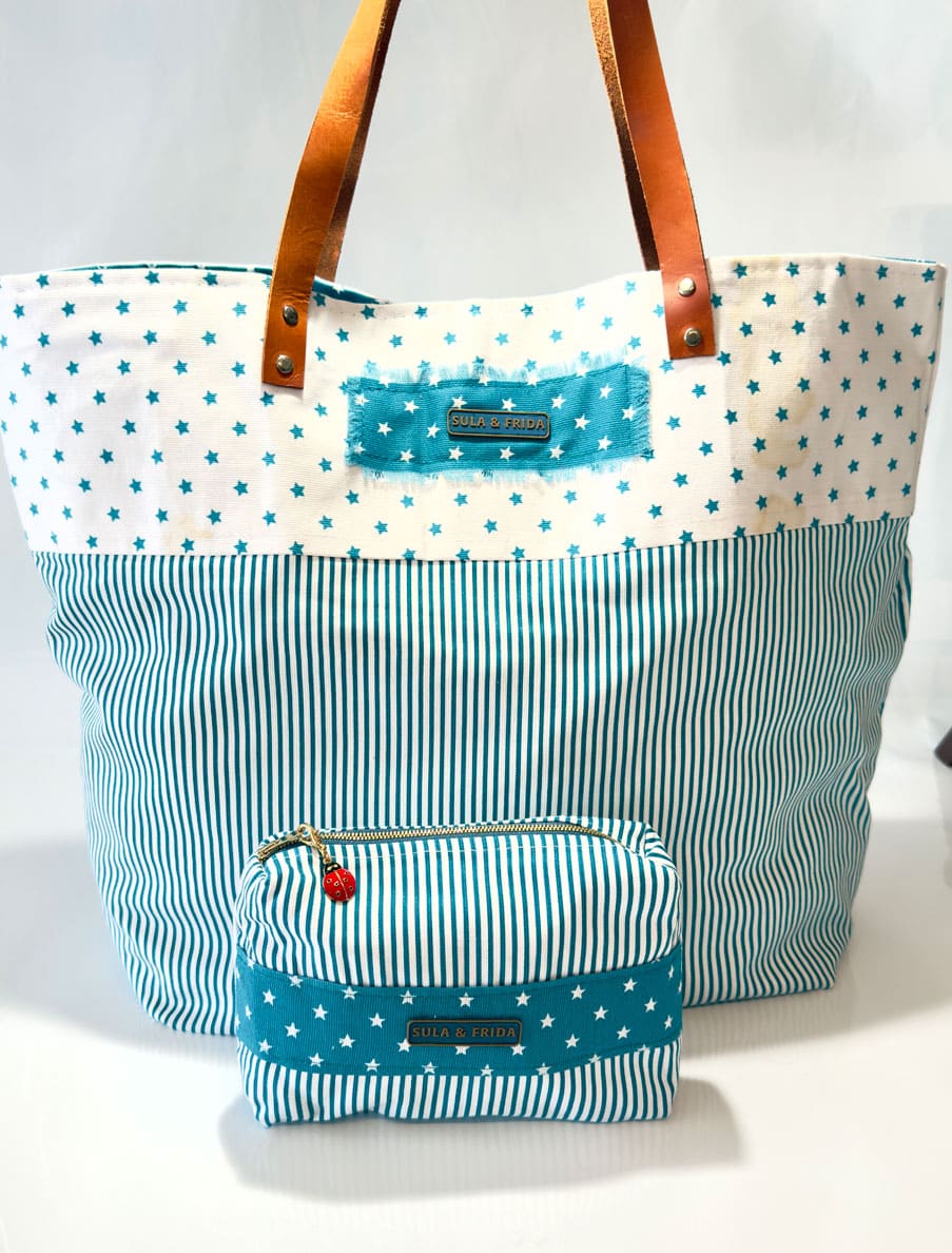 Tote en tela de algodón, combinando tres estampados. Con bolsillo interior y neceser a juego. Asas de piel cortadas y trabajadas a medida.
