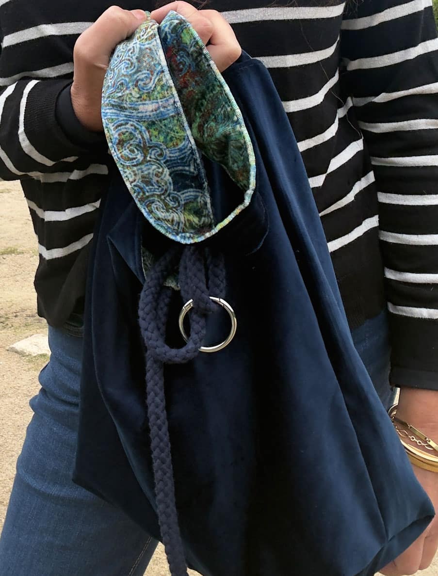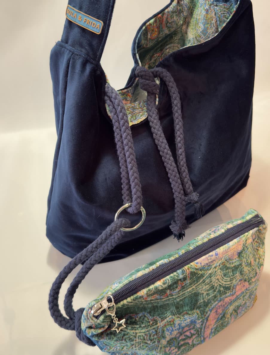 Telas terciopelo de tapicería de primera calidad Inglesa. Azul marino por una parte, y un estampado a juego, haciendo cashemir en tonos verdes, perfectamente combinados para que el contraste, por ambos lados, sean espectaculares. Neceser a juego, sujeto con una argolla para poder, disponer de él, siempre que sea necesario. Cómodo, versátil y de gran capacidad.