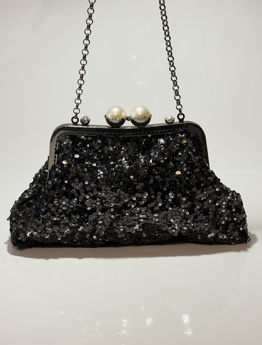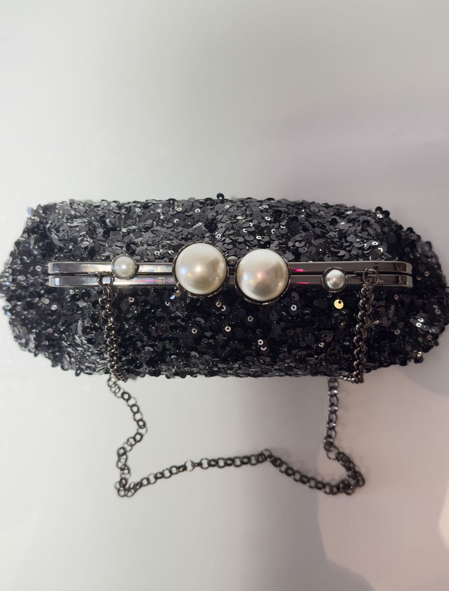 Precioso bolso de lentejuelas negro, con una boquilla de metal cosida a mano. Boquilla de metal con unas perlas que le dan un toque super especial y elegante. Cuenta con una cadena para poder llevar colgado o meterla en el interior y hacer del mismo una preciosa y finísima cartera de mano.