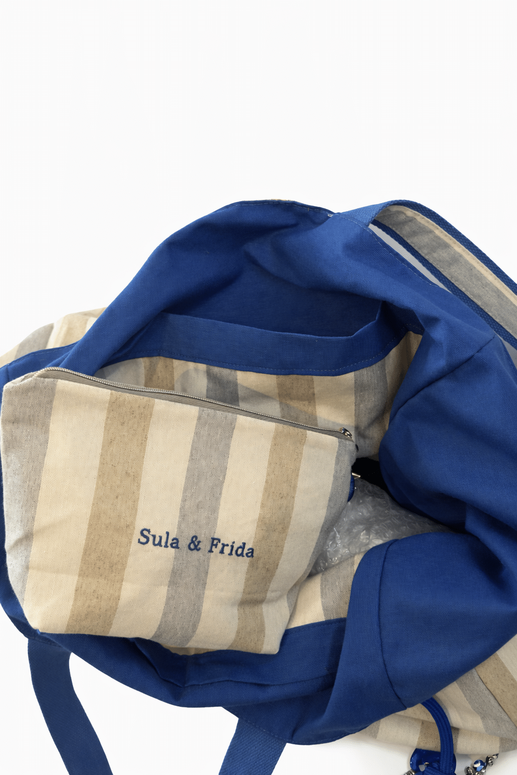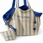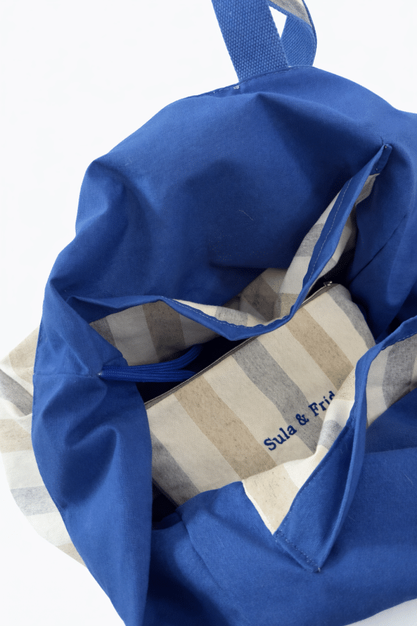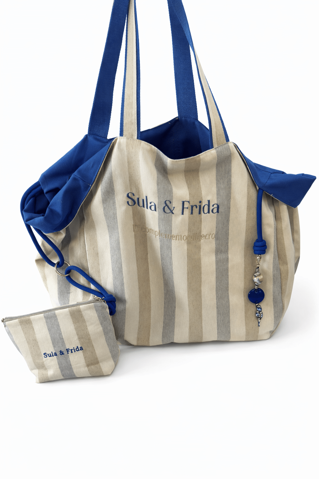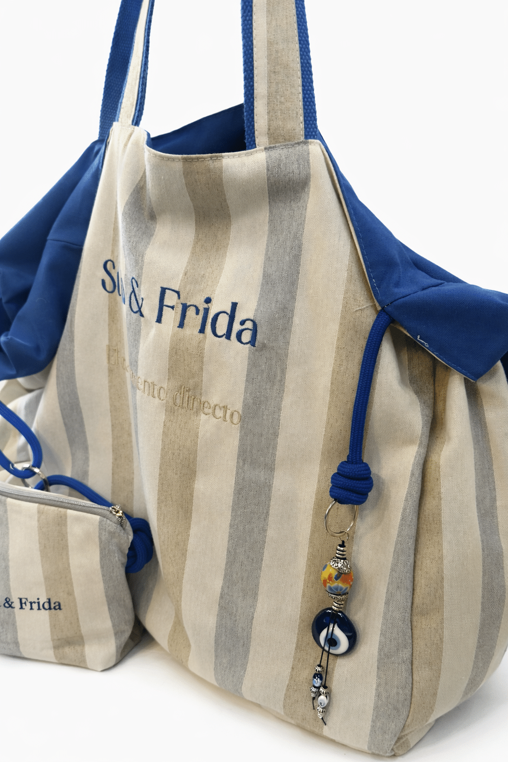 Bolso de playa, tamaño XL, con neceser a juego y doble bolsillo interior. Tela de rayas en tono azul celeste, camel y arena. Precioso. Finísimo, elegante y con estilo. Gran capacidad.