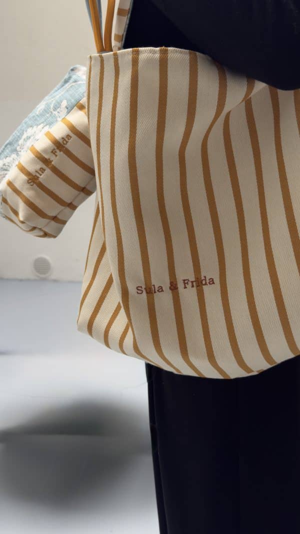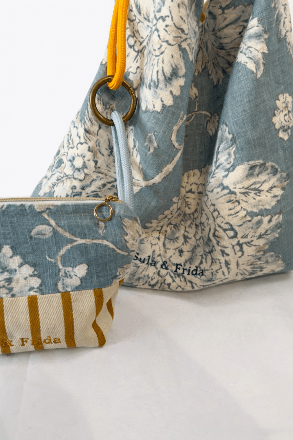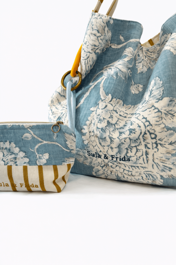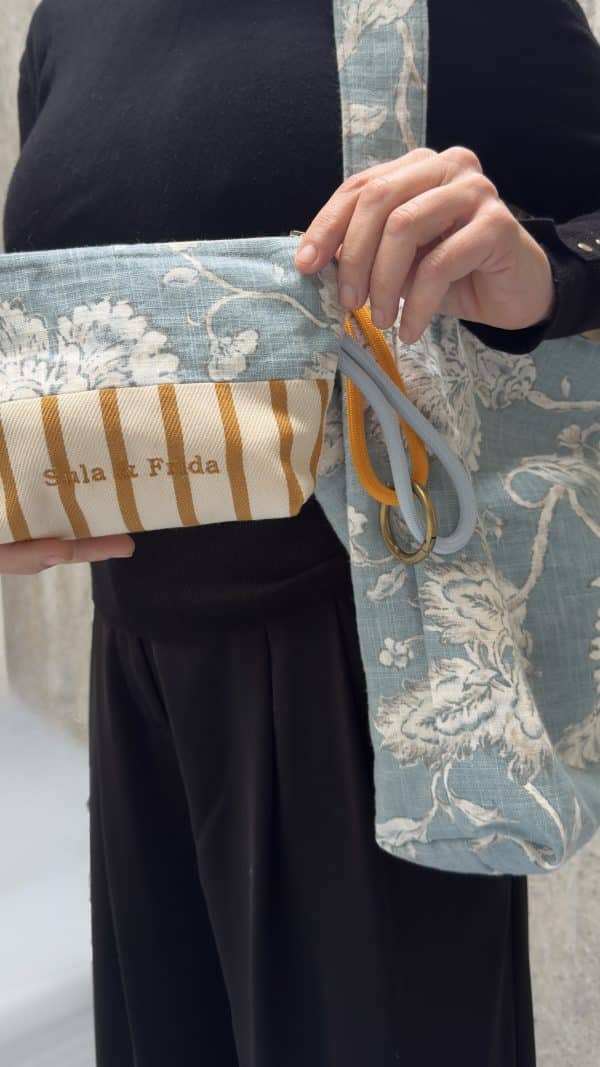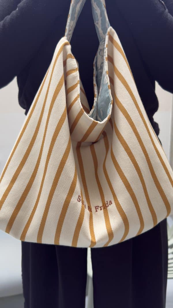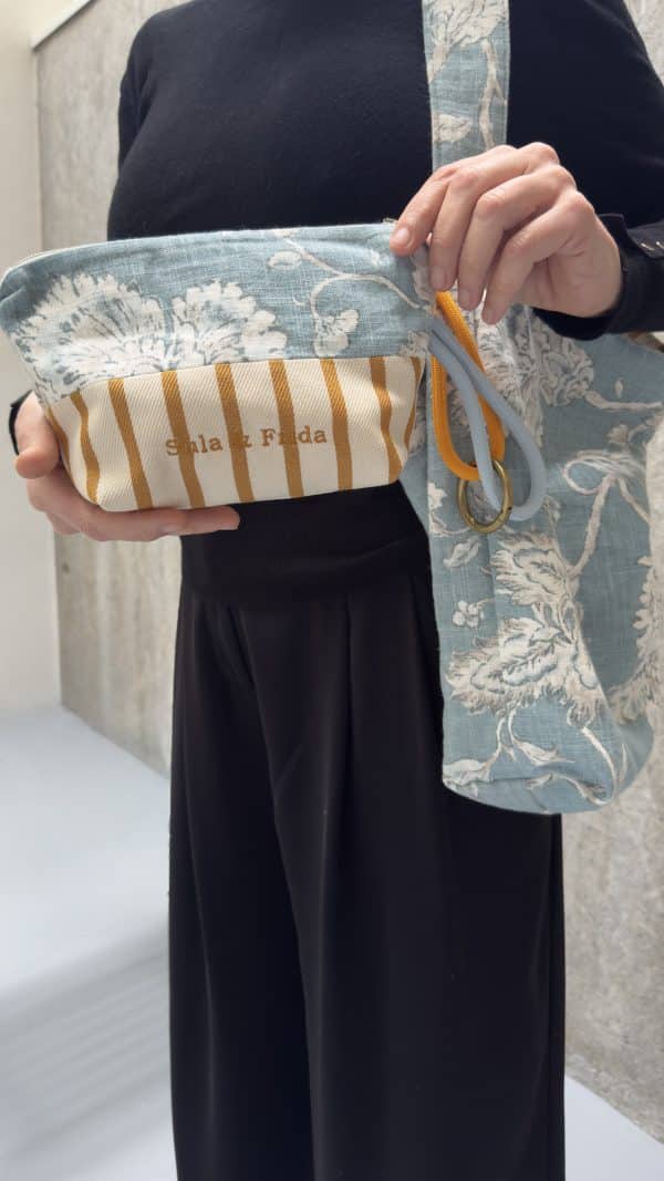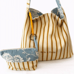Precioso bolso reversible, combinando tela de lino y algodón en estampado azul por uno de los lados y, una fantástica tela de tapicería a rayas color mostaza sobre un fondo crudo. Combinado con su neceser a juego para llevar siempre a mano nuestros «imprescindibles».