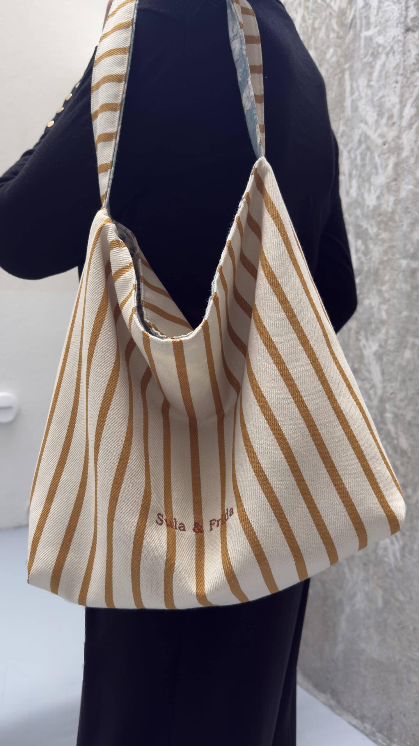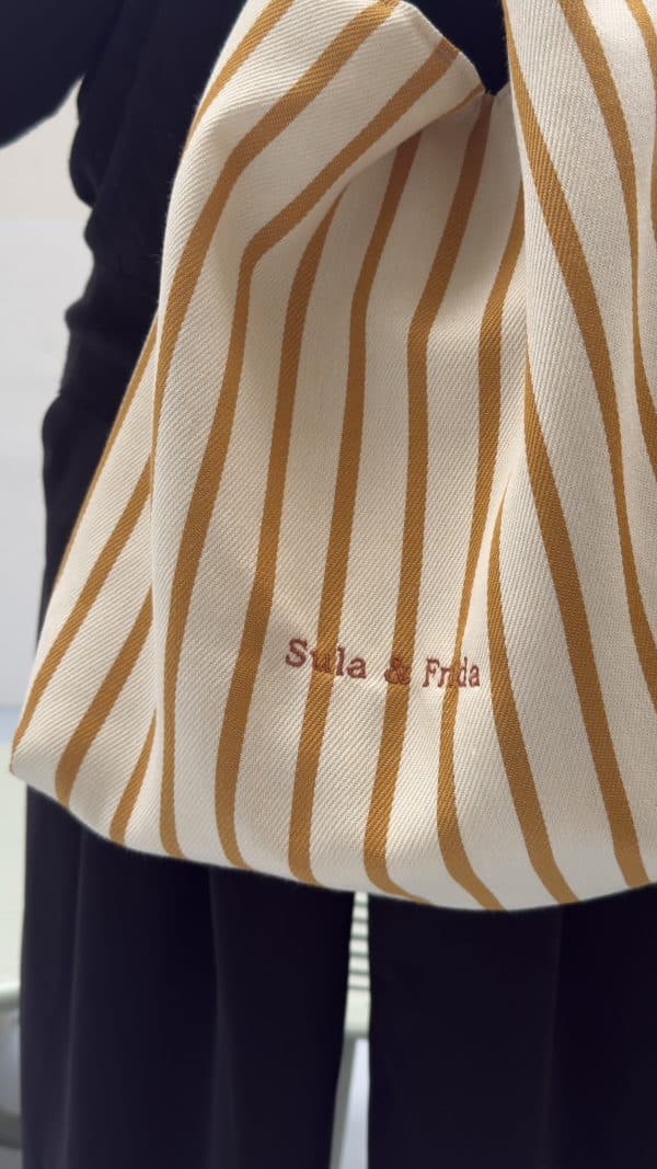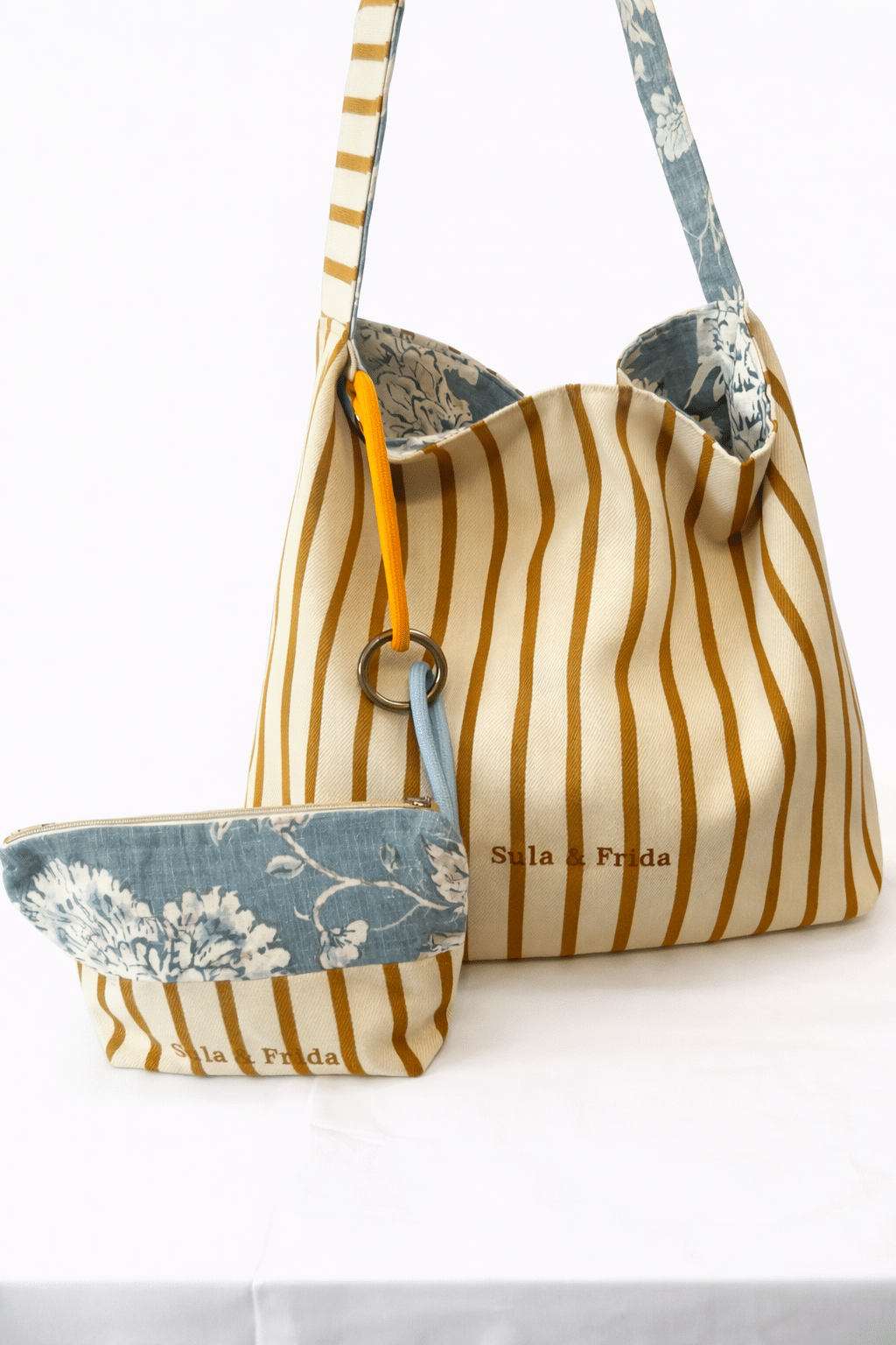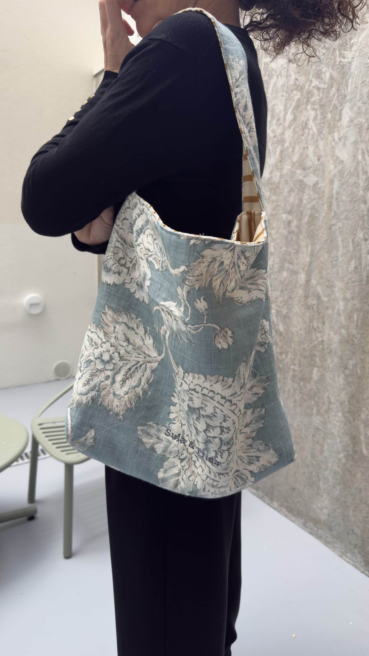 Precioso bolso reversible, combinando tela de lino y algodón en estampado azul por uno de los lados y, una fantástica tela de tapicería a rayas color mostaza sobre un fondo crudo. Combinado con su neceser a juego para llevar siempre a mano nuestros «imprescindibles».