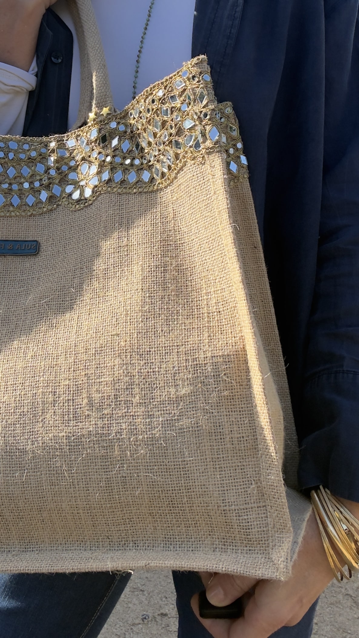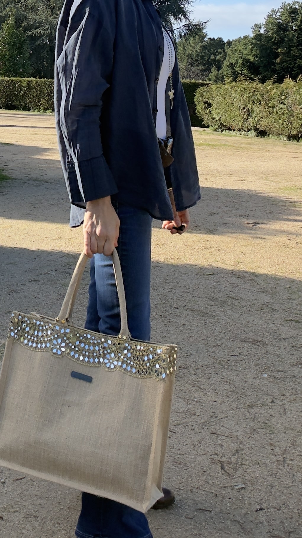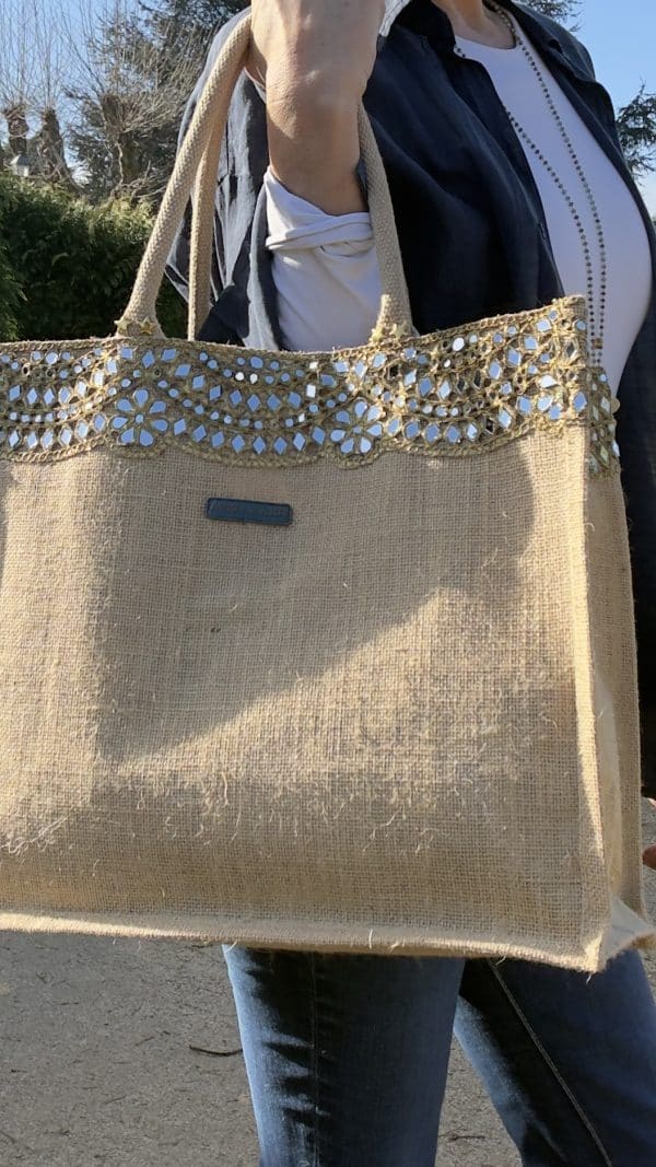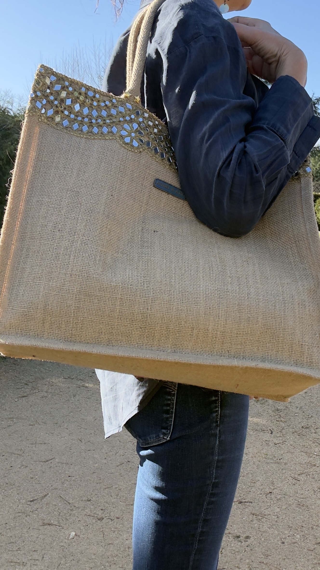Preciosa Tote bag en yute forrado y decorado artesanalmente, con ese encaje combinado con pequeñas piezas de espejo, tan en tendencia. Cuenta con bolsillo interior. Un bolso con un tamaño ideal para poder llevar «casi» de todo. Funcional, original y versátil.
