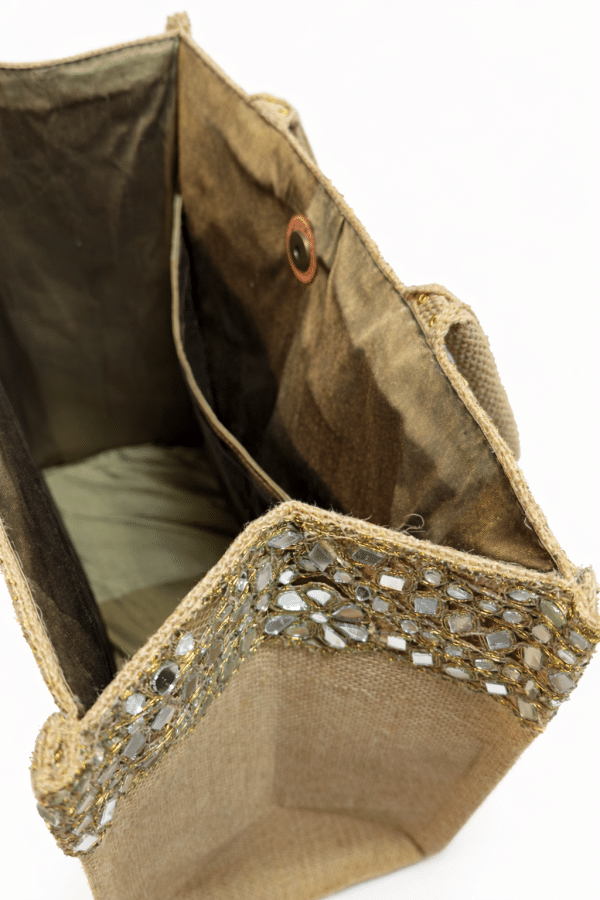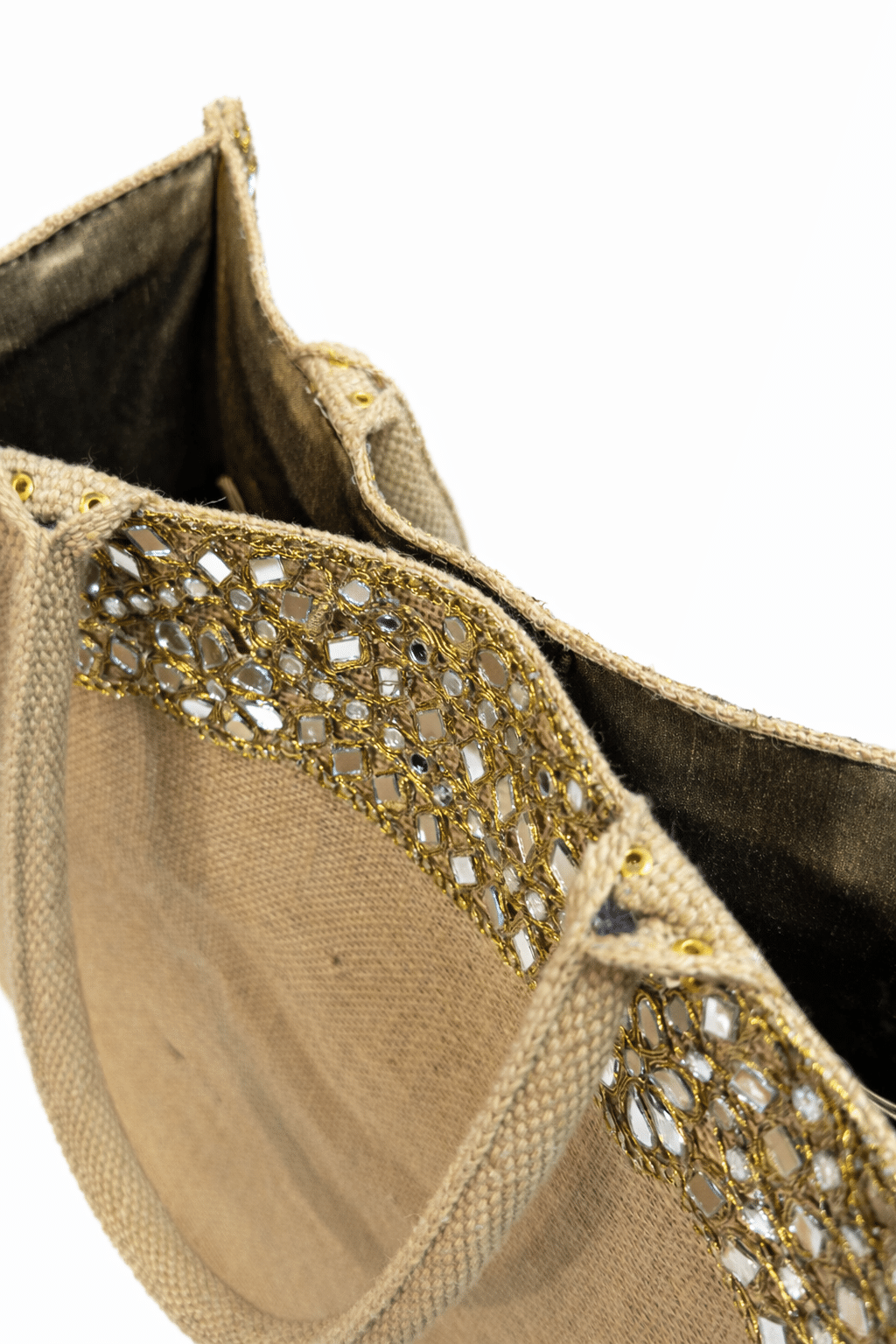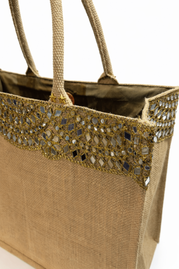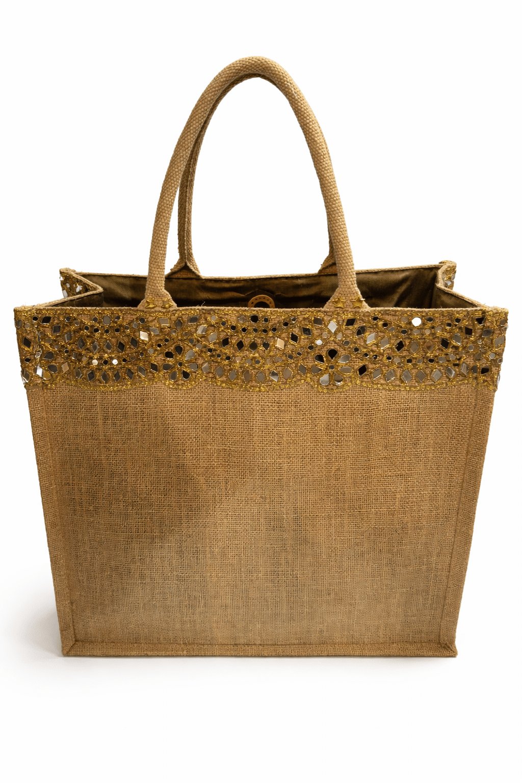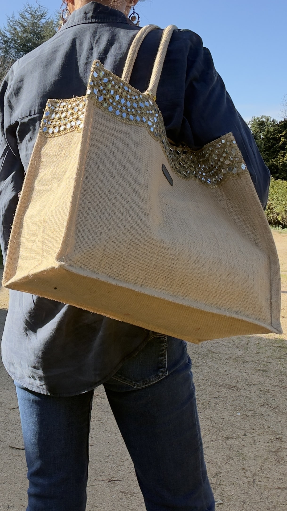 Preciosa Tote bag en yute forrado y decorado artesanalmente, con ese encaje combinado con pequeñas piezas de espejo, tan en tendencia. Cuenta con bolsillo interior. Un bolso con un tamaño ideal para poder llevar «casi» de todo. Funcional, original y versátil.